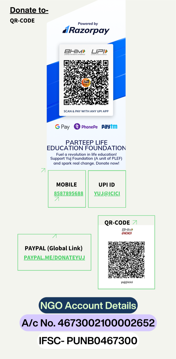 Your support helps us to maintain and expand our services, ensuring that the Yuj Foundation continues to be a hub of knowledge, empowerment, and transformation. Join us in this journey of education and enlightenment. Be the catalyst for change. Contribute to a legacy of learning, and help us to make the Gurukul system—a symbol of comprehensive and accessible education—a reality once again.
